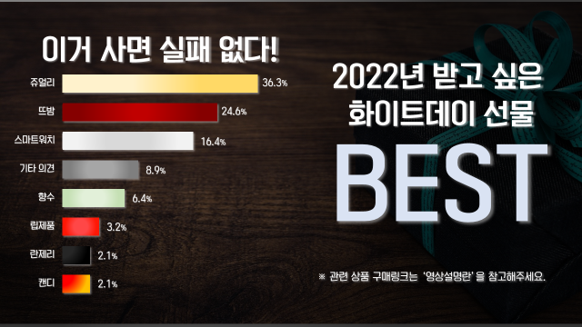 얼마전 발렌타인데이 선물 추천 투표를 했었는데요 여성분 281명을 대상으로 앙케이트 실시 2탄! 이번에는 이거사면 실패없다. 여자들이 받고싶은 화이트데이 선물 베스트입니다. 여자들이 받고 싶은 화이트데이 선물 베스트 중 8위는 사탕...즉 꼴찌인데요. 이유는 사탕 자체가 싫은것도 있고 초콜릿과 비교해서 처치 곤란인 경우가 많다고 합니다. 사탕을 줄거면 차라리 초콜릿을 줘라! 그래고 절대 양으로 승부볼 생각을 하지 마라는 의견이 많은데요 간혹 여성들사이 선물에 대한 이야기를 들어보면 알겠지만 편의점에서 쉽게 살수있는 사탕은 최악. 아주 조금마나 더 "성의"를 담아서 준다면 성공할수 있다고 합니다. 이왕 사탕을 줄거면 편의점 사탕말고 정성이 담긴 선물세트 혹은 초콜릿 선물을 주시면 된다고 합니다. 츄파춥스 ..
